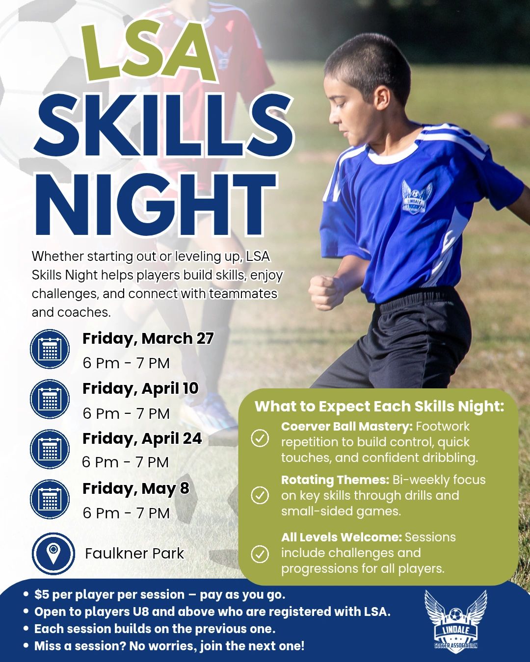 If you’re looking to improve your game, sharpen your skills, or just have fun as the sun sets, this is your chance. Open to 𝐫𝐞𝐠𝐢𝐬𝐭𝐞𝐫𝐞𝐝 𝐋𝐒𝐀 players U8 and older — just bring your cleats and your game face!
